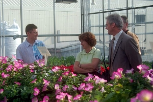 Gartenbauliche Berufe verlangen umfassende Kenntnisse von Pflanzen und Technik und vor allem Fertigkeiten in vielen anspruchsvollen Arbeitsabläufen. In der Fortbildung an den Pillnitzer Fachschulen für Gartenbau und Technik können gestandene Facharbeiter dann das Rüstzeug für die Führung eines Betriebes erlangen. | In den Gewächshäusern der Hochschule für Technik (HTW) wird nicht nur durch eine kleine Cafeteria für das leibliche Wohl gesorgt: Gemüsekulturen in Dünnschichtverfahren, Neue Zierpflanzen und modernste Gewächshaustechnik sowie grüne Wände gibt es zu bestaunen. Das neu strukturierte Studienangebot der HTW wird vorgestellt. Auch im Gartenbau werden, international passfähig, jetzt Bachelor- und Masterstudiengänge angeboten. Poster zu besonders interessanten Projekt- und Diplomarbeiten runden die Informationen der HTW ab. |